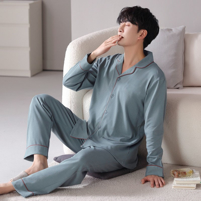 シンプルな無地のパジャマ、男性用、高品質の純綿カーディガン、長袖、若い男性向け、高級感のあるカジュアルなホームウェア、ツーピースセット