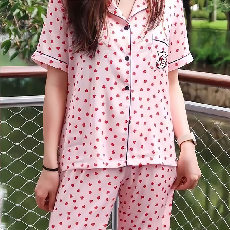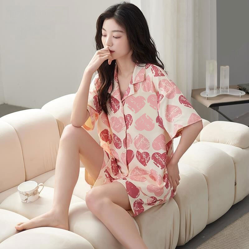 夏の涼しげな女性のパジャマは綿の半袖の半ズボンの女性の新型の甘い風の粉の愛の家庭服をまねて外に着ることができます。