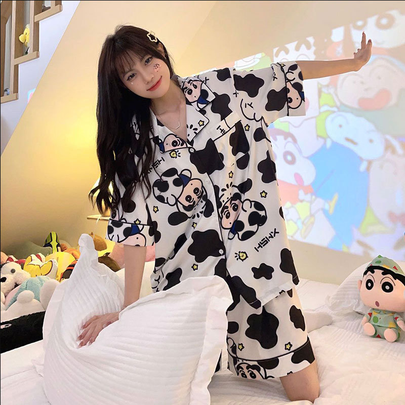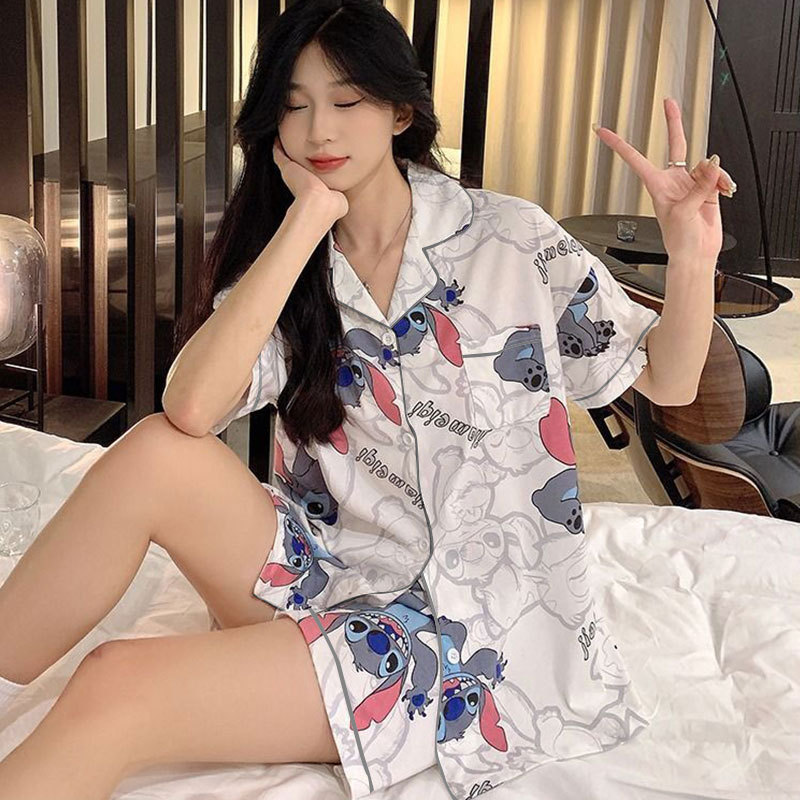漫画かわいい夏のパジャマ女性スティッチ日系風模造綿半袖ショーツカーディガンカジュアルホームウェアセット