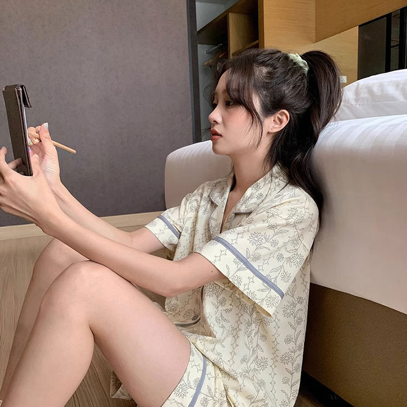クロスボーダー卸売りパジャマ女性フランス式田園小清新砕花カーディガン半袖半ズボン学生家庭服二点セット