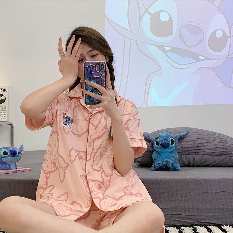 夏の起爆史迪仔パジャマ女性半袖カーディガン甘いアニメかわいい少女風ホームウェア2点セット