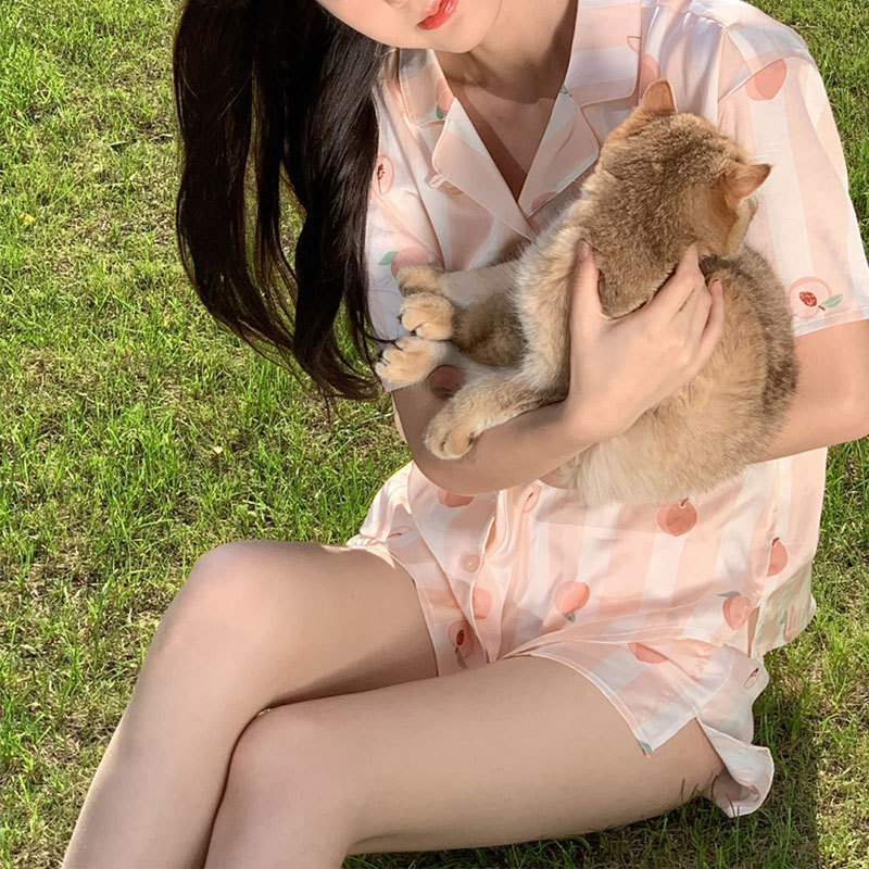 夏の韓国版のパジャマの女性の新型は綿の半袖の半ズボンの甘い水蜜の桃のカーディガンの襟の家庭服のスーツをまねます。