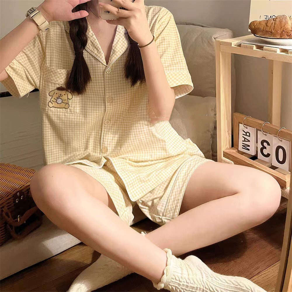 日系パジャマ女性格子布丁犬模造綿学生半袖半ズボンかわいい甘いカーディガン部屋服セット