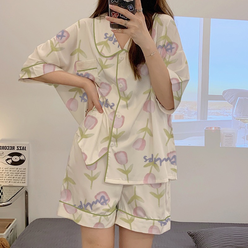 小紅書同項田園風花卉チューリップ甘い夏パジャマ女性半袖半ズボン家庭服2点セット