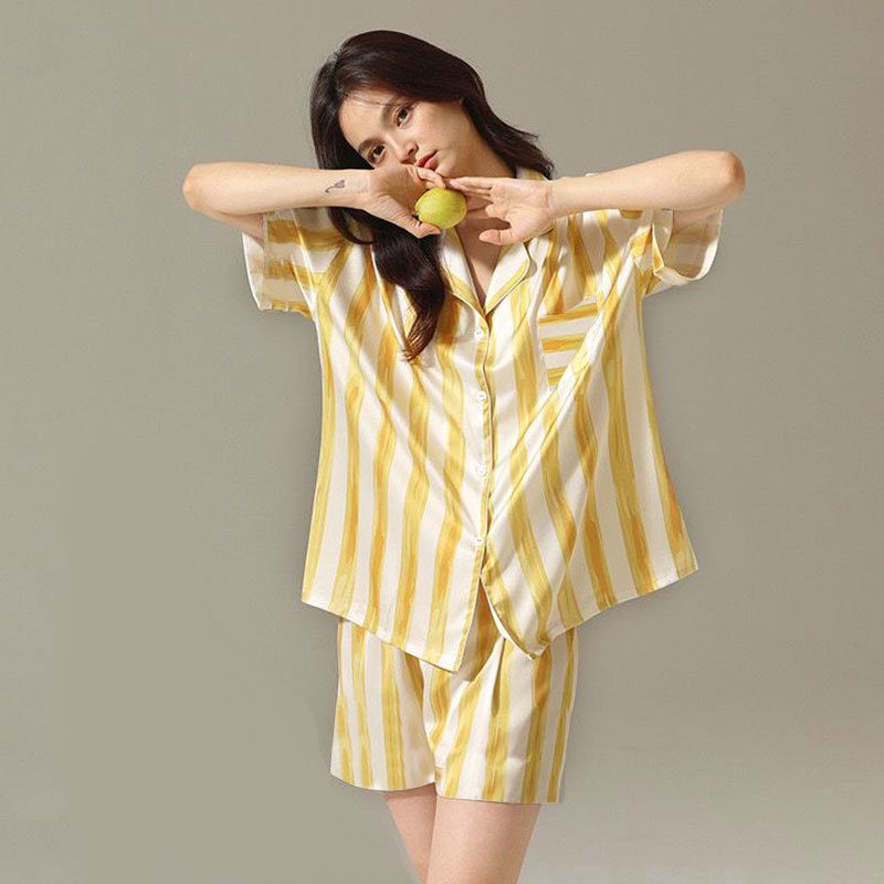 日本風パジャマ女性半袖半ズボンストライプ家庭服シンプルカジュアル綿高級感同種カーディガンセット