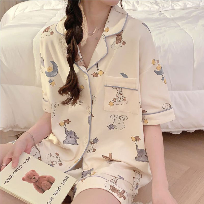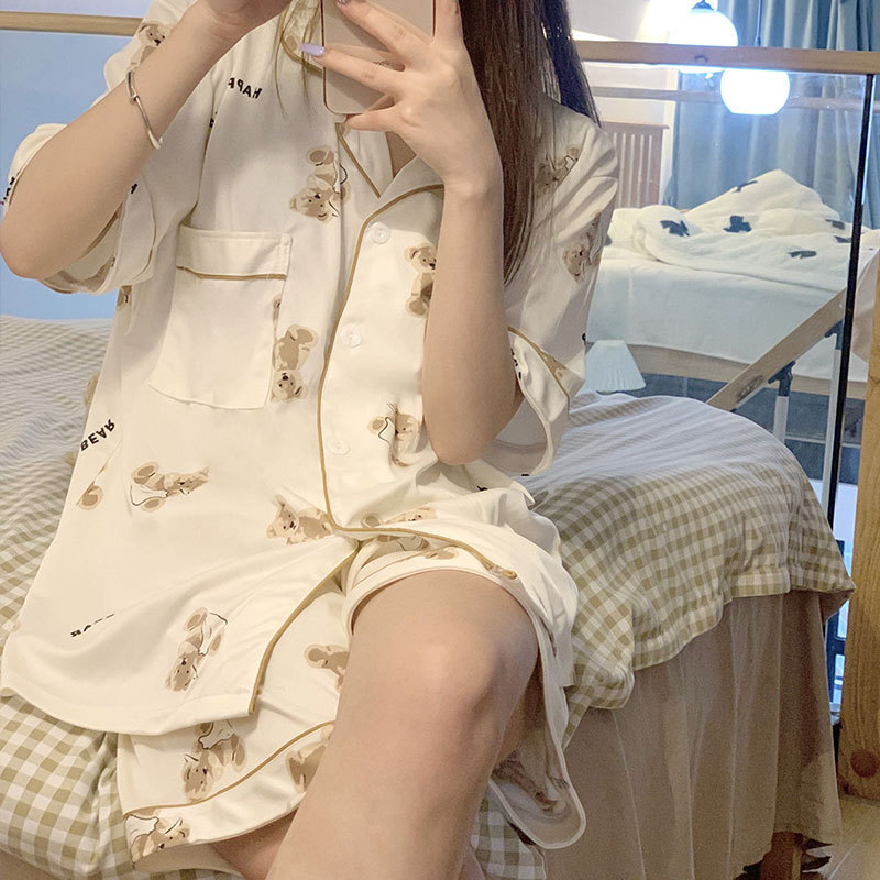 日系かわいいアニメプリントブラウン熊水色パジャマ女性夏半袖減齢風ホームウェアセット