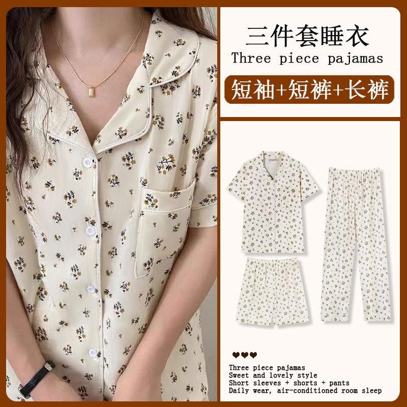 柔らかくワックスのような小花柄の夏のパジャマ、女性用カーディガン、模造綿半袖3点セット、女の子用ゆったりとした年齢を軽減するホームウェアセット