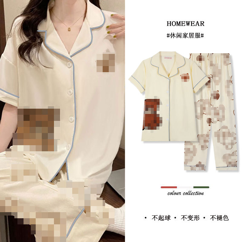 日本の夏の女性用パジャマ、模造綿半袖ズボン、女の子用カーディガン、漫画のクマ、トレンディなシンプルなホームウェアセット