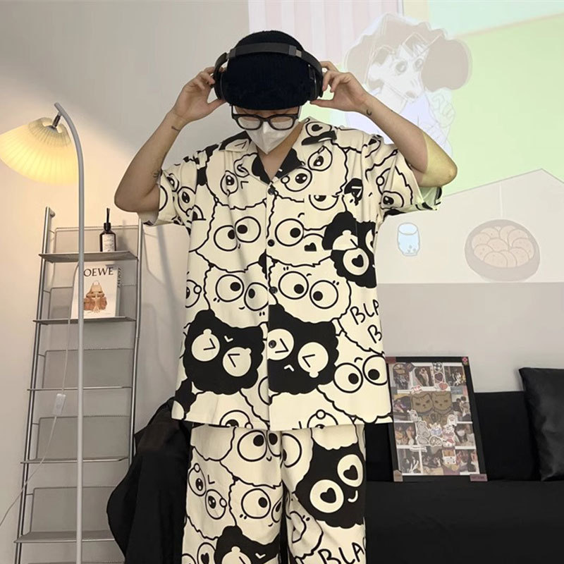 韓系パジャマ男夏は綿のようにアニメの石炭ボールの短いロングタイプの男性のゆったりした大きいサイズの家庭服の2つのセットを作ります。