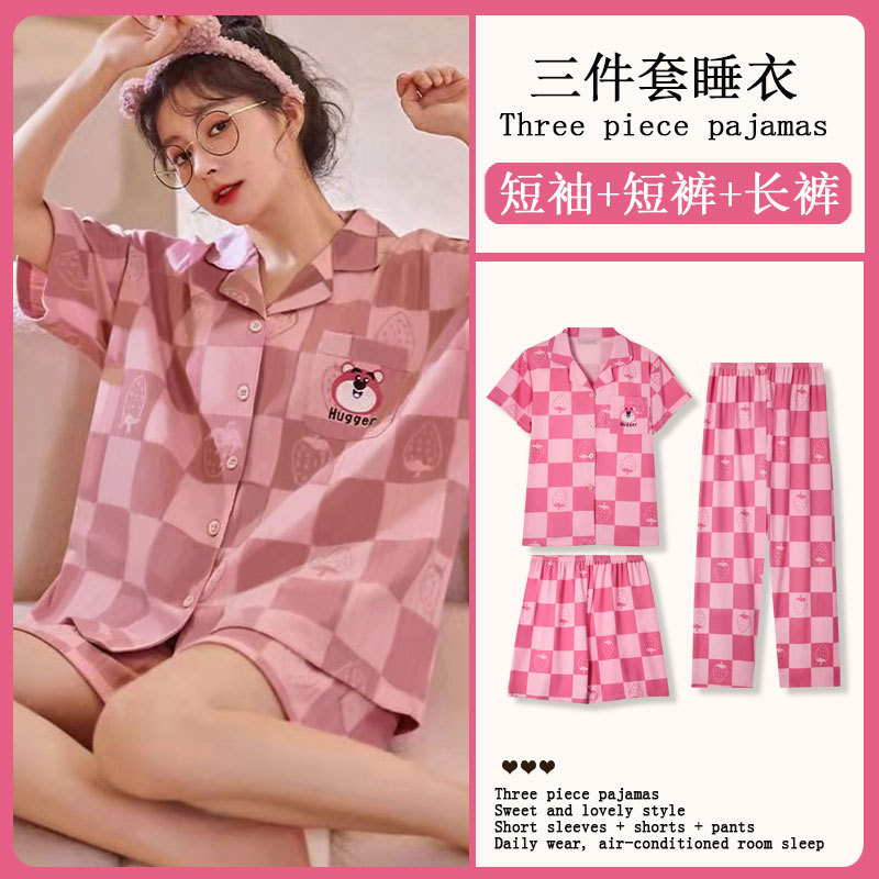日本の漫画チェック柄イチゴクマパジャマ女性の夏のカーディガン模造綿学生ルーズホームウェアカジュアル 3 点セット