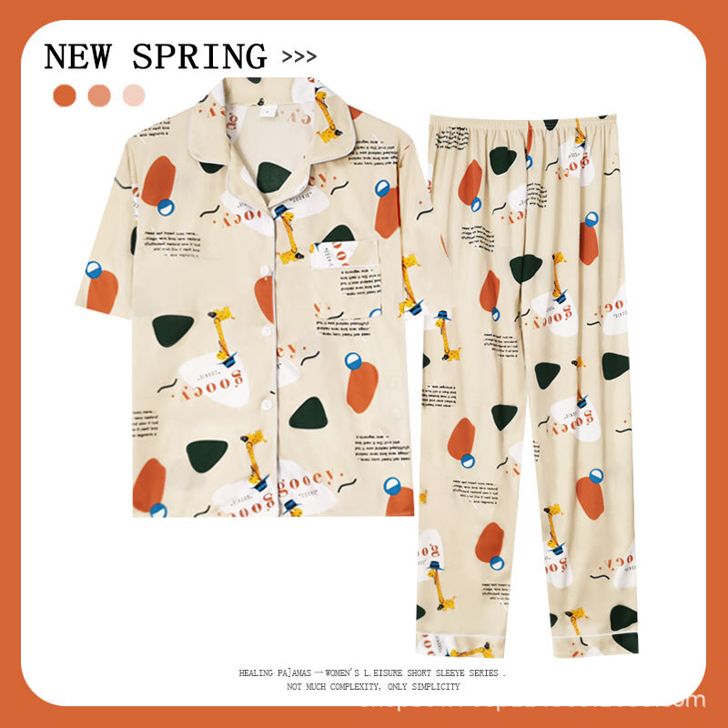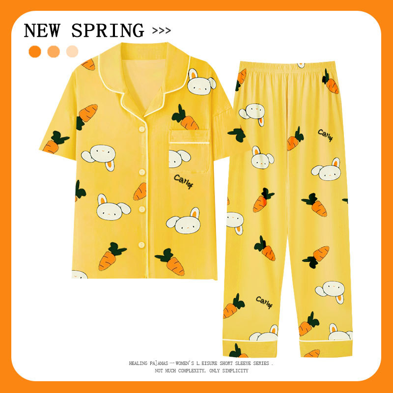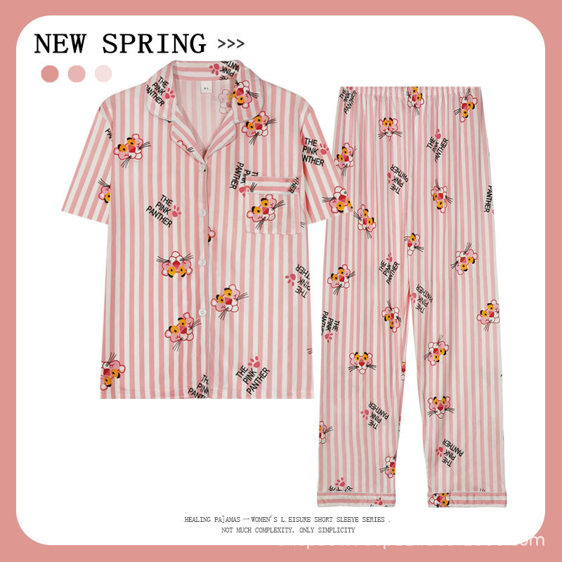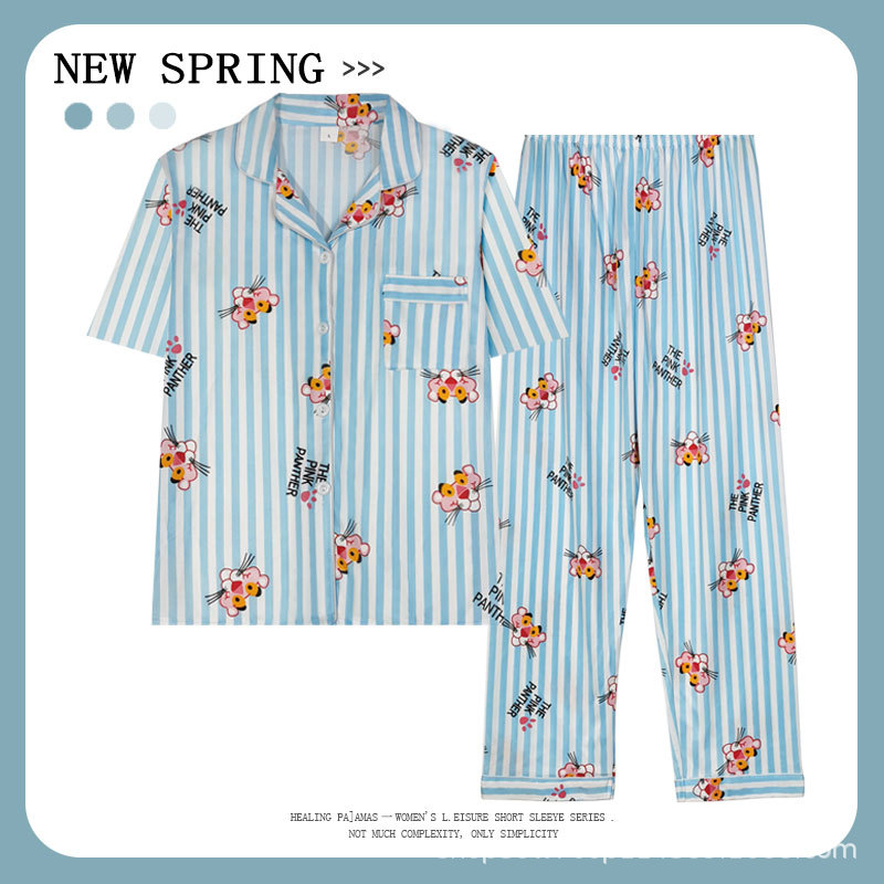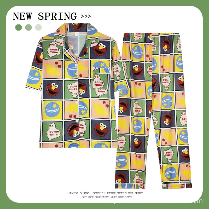 韩版时尚INS风睡衣女卡通可爱秋季开衫短袖长裤女士家居服可外穿