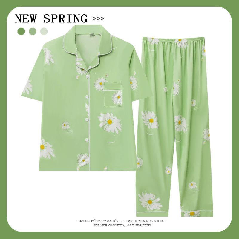 【緑の菊の花】夏の新しいパジャマの女性の半袖の2つのセットの小さい清新な田園風のカーディガンのズボンの家の服