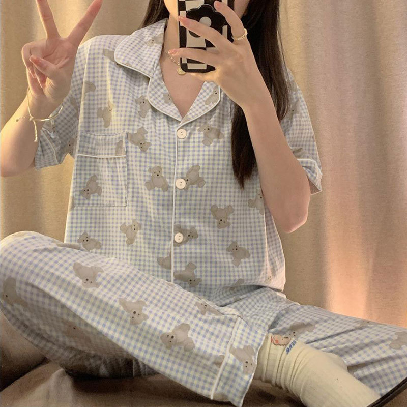 新型ins格子アニメ熊半袖長ズボン2点セットかわいい学生寮は家の服を着ることができる
