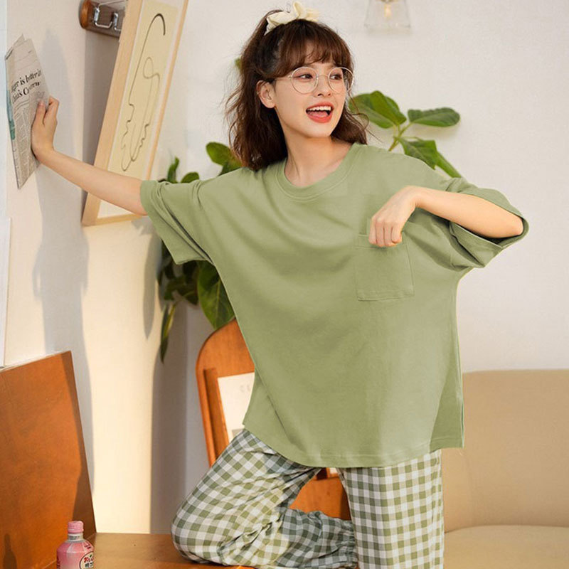 夏の新作パジャマレディース半袖長ズボン丸首2点セットシンプルカジュアル純色チェックパンツホームウェア