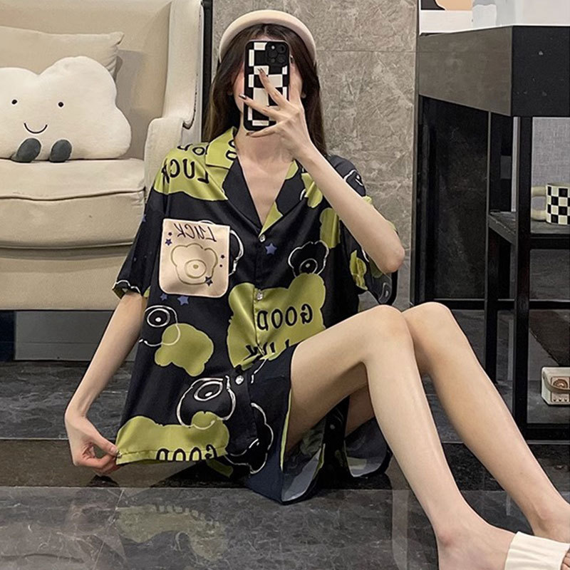 ネットの赤いパジャマの女性の夏の2024年の新型の漫画の緑色の熊のゆったりしている大きいサイズのショートパンツのカーディガンの女性の2つのセット