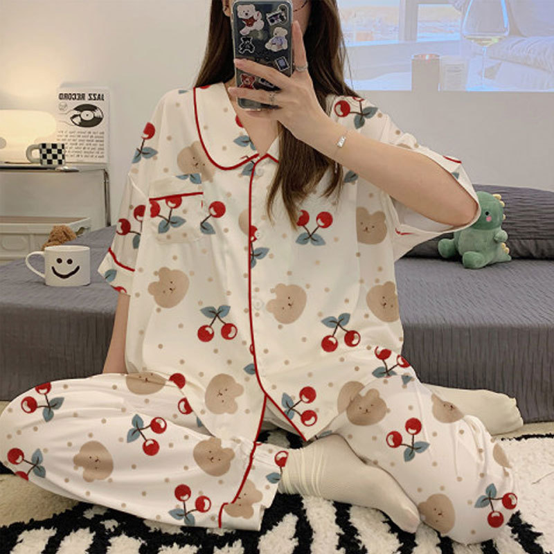 2024夏に起爆したさくらんぼベアーパジャマ女性半袖長ズボン家服日韓系甘美風2点セット