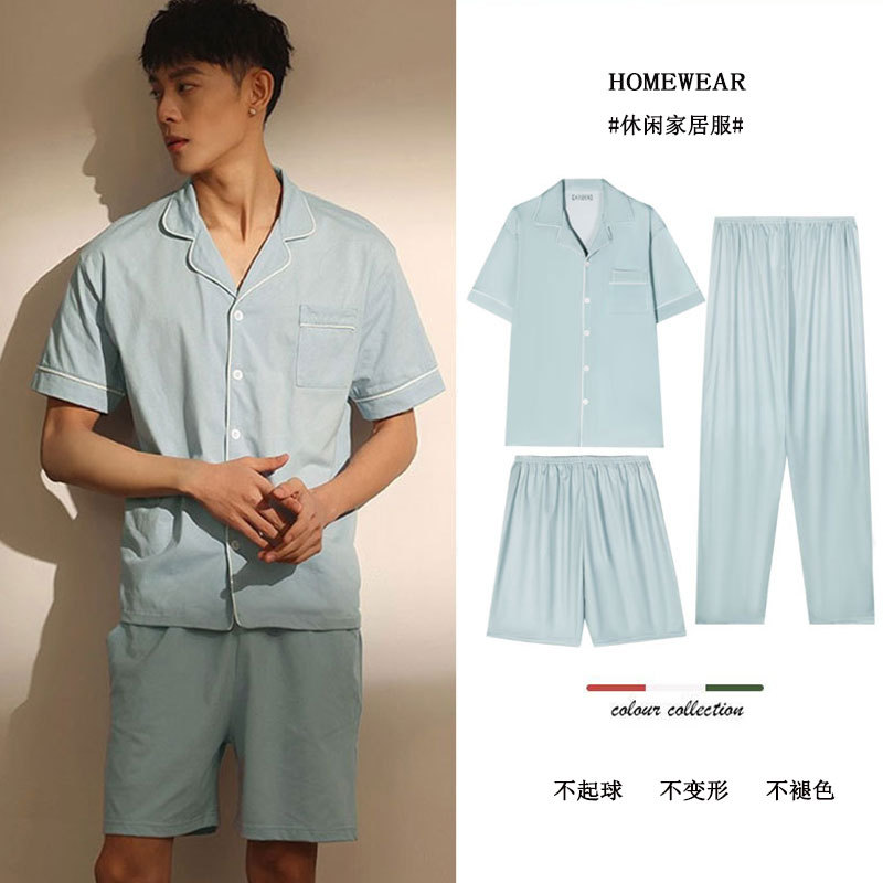 パジャマ男の夏は綿のカジュアルファッションの新しいカーディガンの夏の3つのセットの男性の高級感のある家庭服のスーツをまねます。