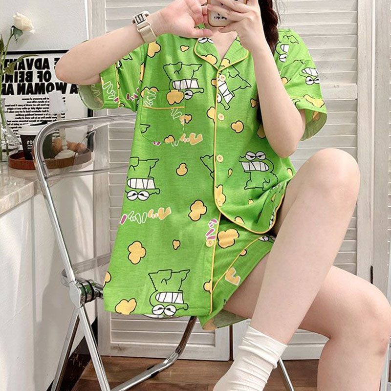 日本系パジャマ女性夏模造綿新作insアニメかわいい緑ワニ高顔値夏タイプホームウェアセット