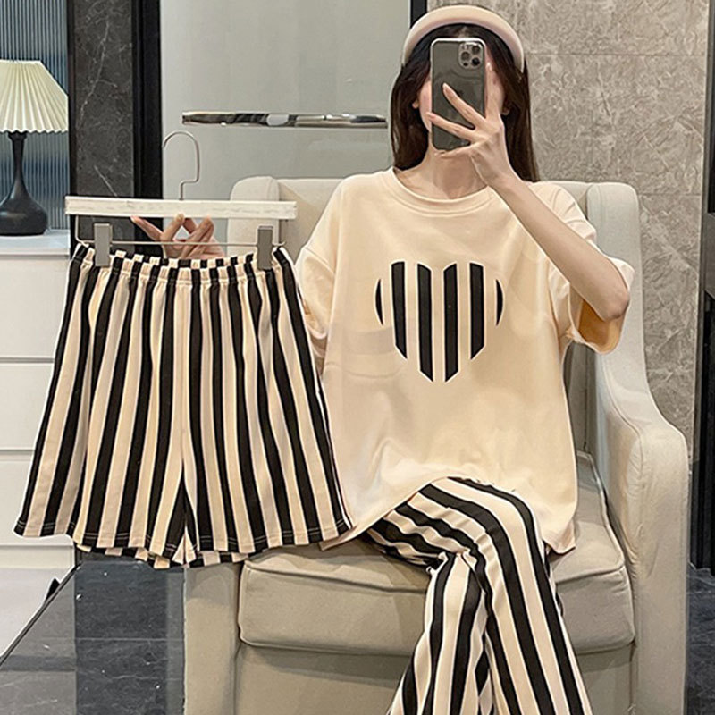 パジャマの女性の夏の半袖の3つのセットは綿の薄い金の甘い漫画のレジャーの学生の寮をまねて部屋の服を着ることができます。