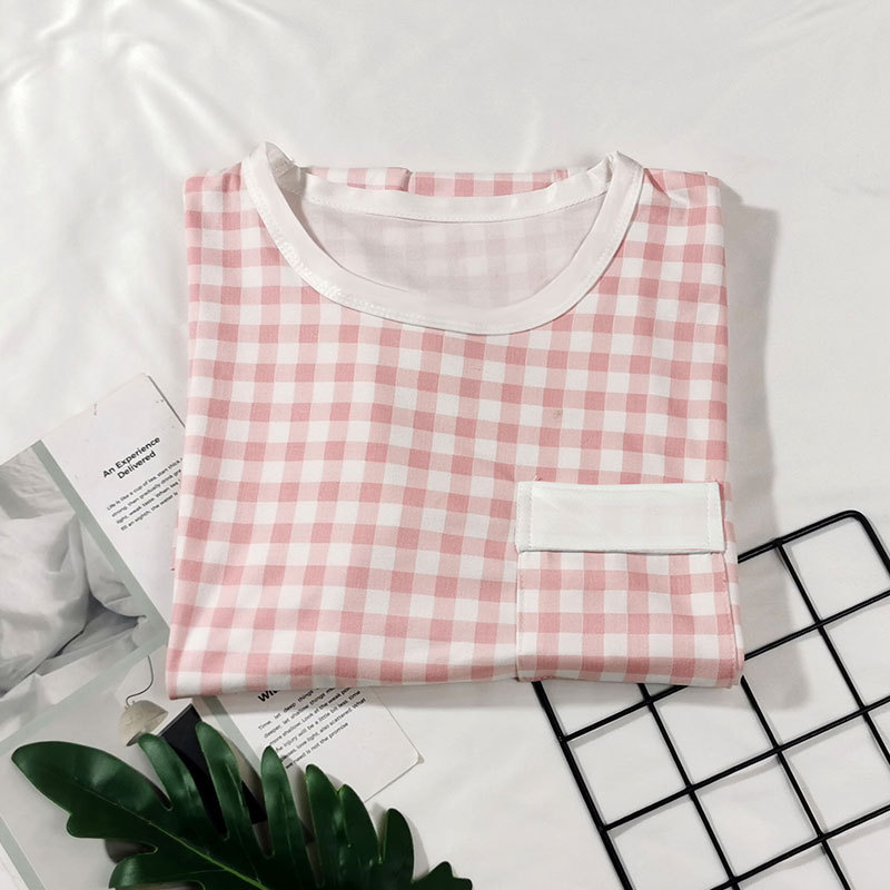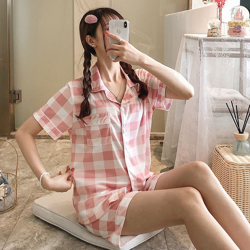 韓国系パジャマ女性半袖半ズボン新型カーディガン実写ピンクの格子かわいい少女カジュアル家庭服セット