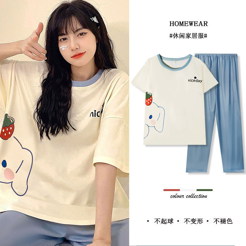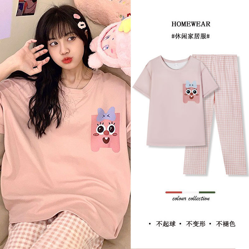 クロスボーダー卸売りパジャマ女性夏半袖長ズボン丸首家庭服アニメ甘い少女寮外着セット