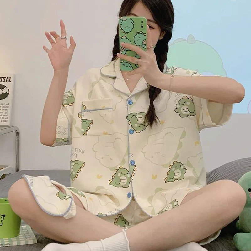 ネットの赤いパジャマの女性の夏の半袖の半ズボンの漫画の日系は綿の小さい恐竜をまねてカーディガンの学生の部屋の服のカバーを折ります。