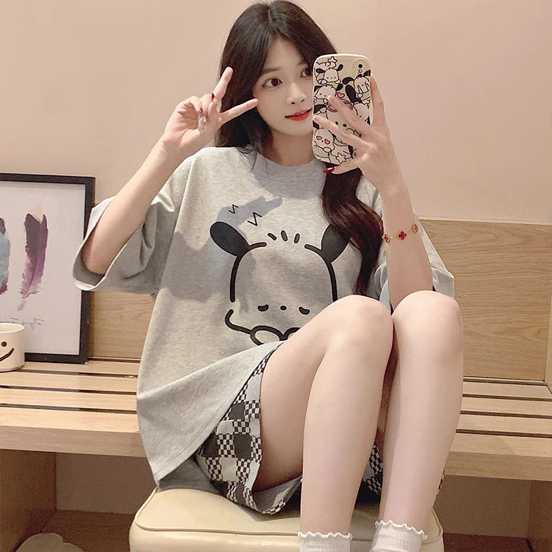 日系ins新商品格子ズボン丸首半袖半ズボン少女風学生ゆったり大サイズ寮ルームウェアカバー
