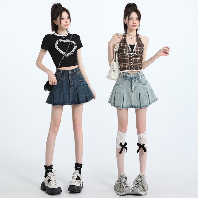 2025夏の新型水色高腰デニムスカートの女性は痩せています。