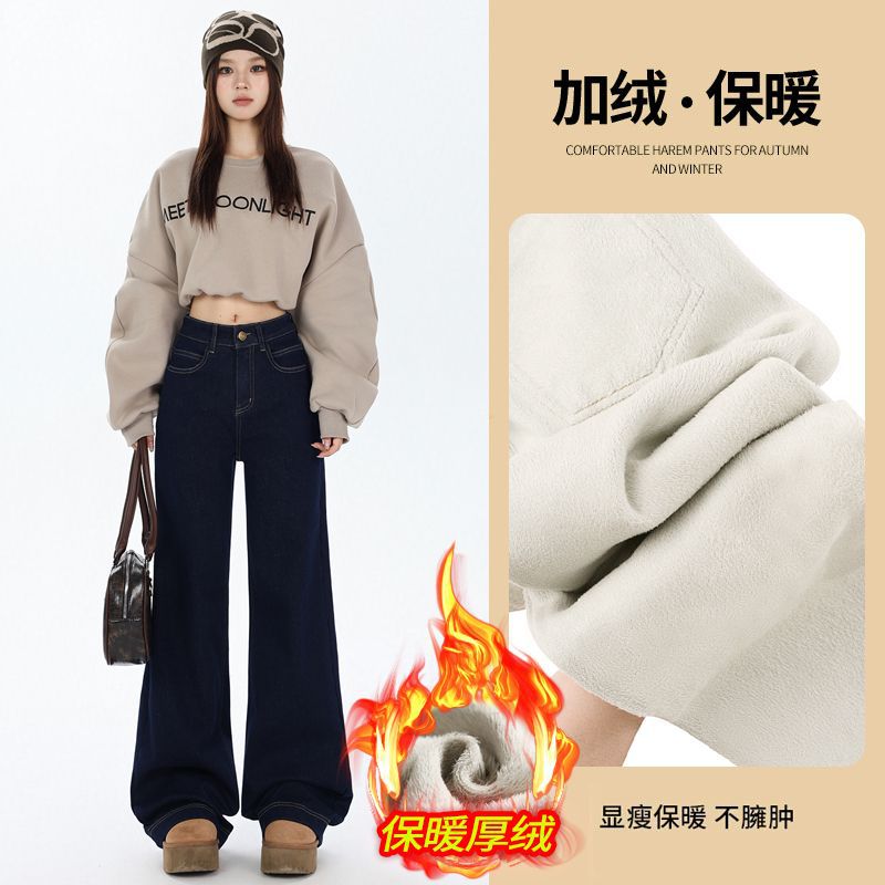 2024冬にベルベットを厚くした高腰ストレートジーンズの女性は、ゆったりとした垂れ下がった感じがして、ズボンを引きずっている