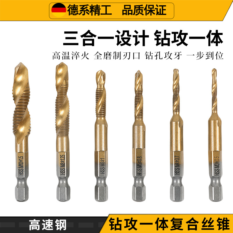 ハイス鋼六角シャンクスリーインワン複合タップ、ドリル、タッピング、面取り一体型スパイラルタッピングタップ