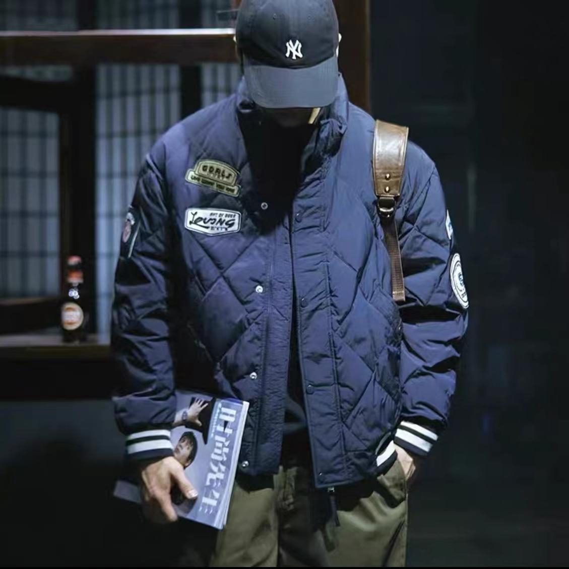 日系レトロ厚手野球服男性ファッションブランド秋冬立襟ゆるい大きいサイズ保温菱格綿服コート