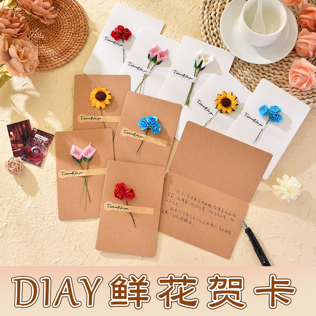 クリエイティブ手作り紙花グリーティングカードメッセージカードDIYレトロクラフト紙ドライ花グリーティングカード祝日通用グリーティングカード誕生日