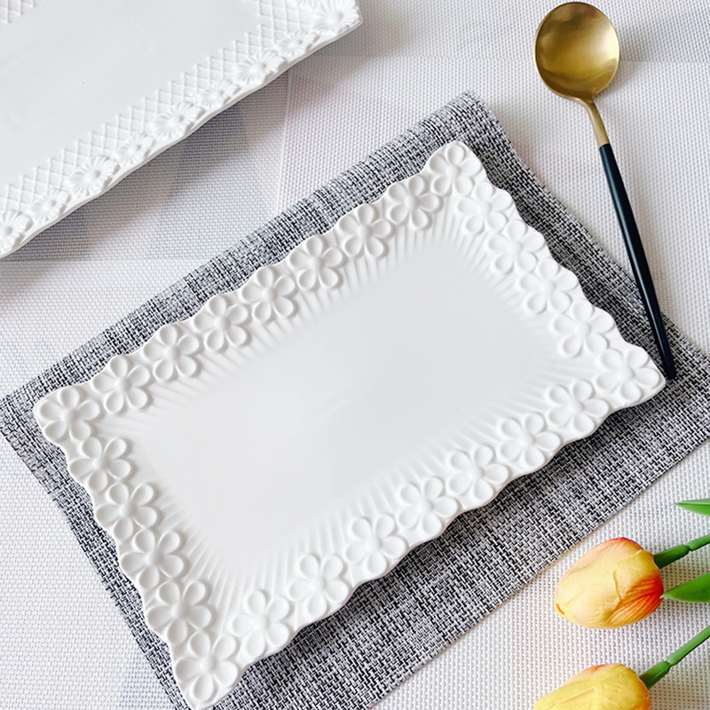 ヨーロッパのレリーフセラミック長方形プレート家庭用魚プレートペストリースナックトレイ純白クリエイティブロングデザートプレート
