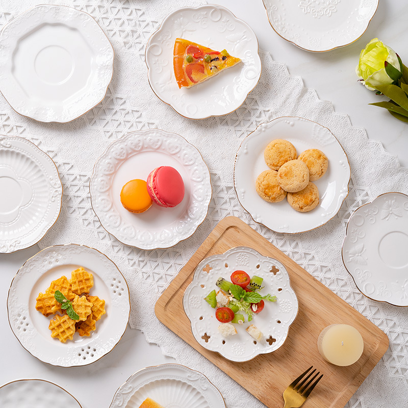 ヨーロッパのレリーフ金縁プレート家庭用セラミックプレートケーキプレートデザートスナックプレートフラットプレートジュエリー装飾プレート