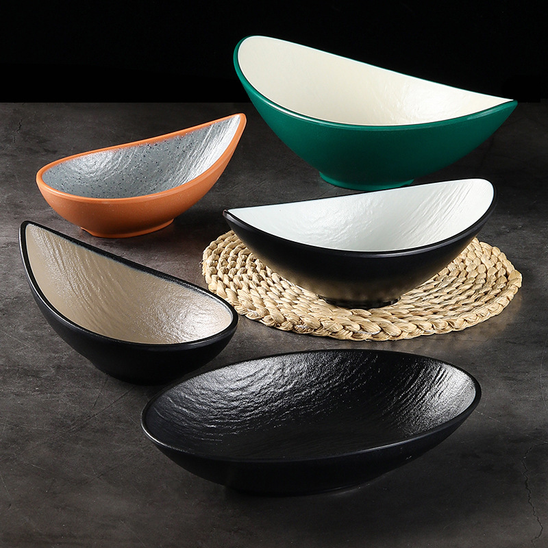メラミン楕円形の元宝碗は磁器のレストランの前菜の軽食の皿のプラスチックの商用ホテルの異形の船形のサラダの碗に似せます。