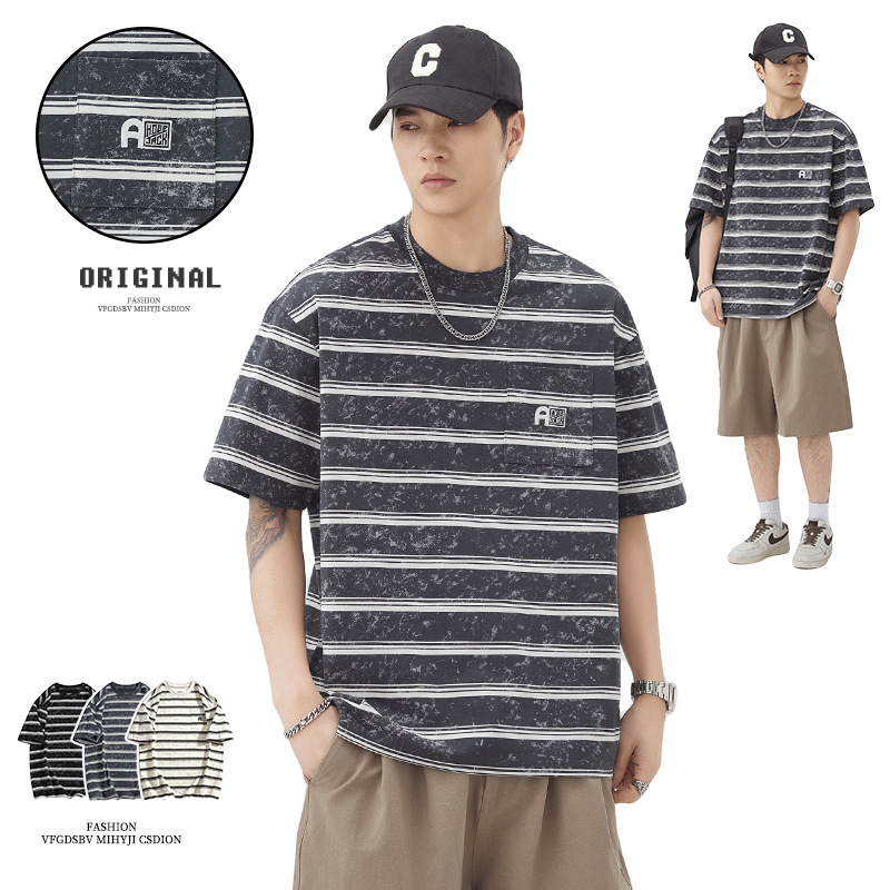 ストライプtシャツ男性新型アメリカンファッションメンズ丸首半袖ゆったりカジュアル香港風男性半袖ins夏