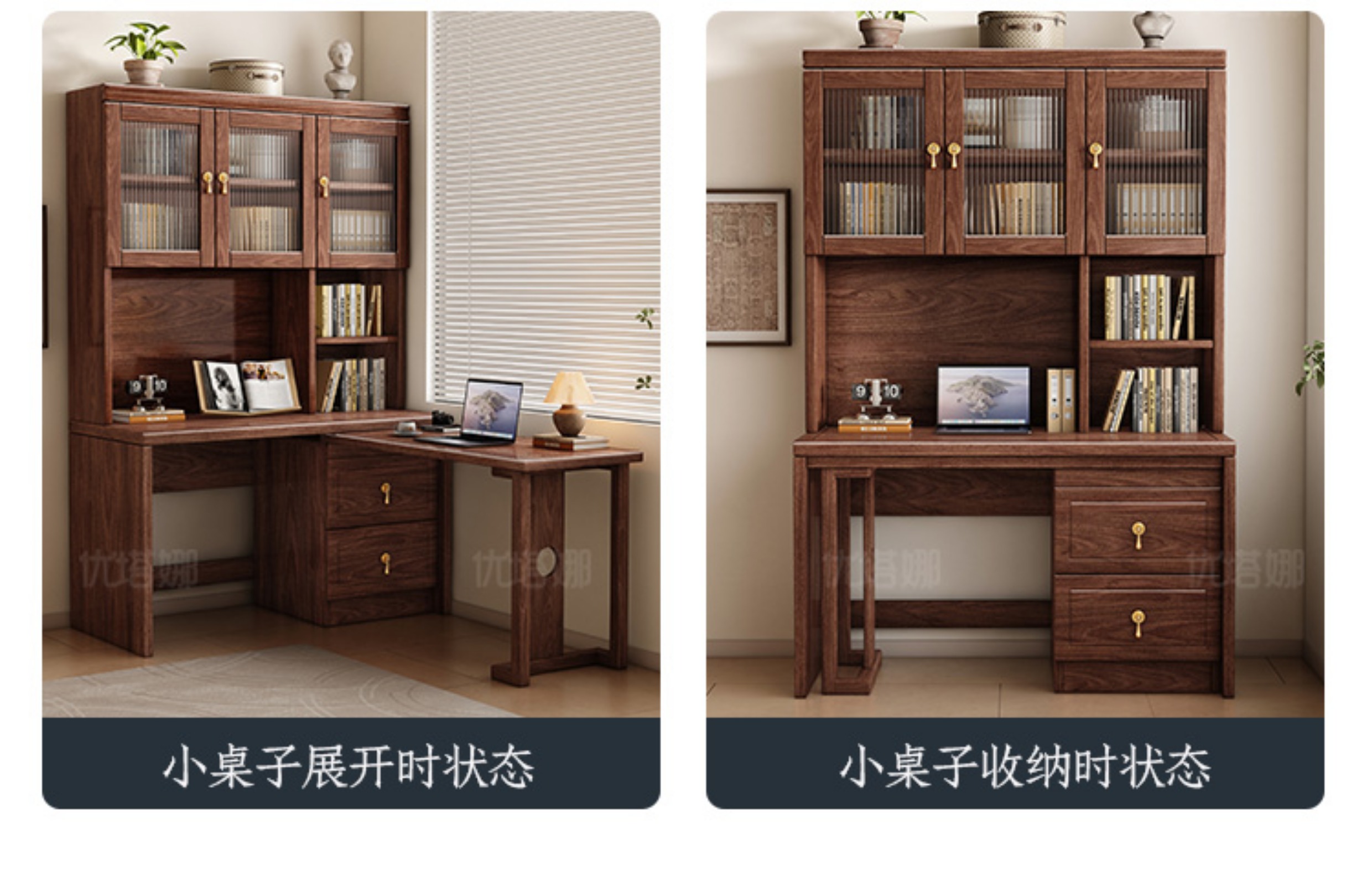 新しい中国式の実木の机の本棚の一体家庭用コンピュータの机の本棚のコーナーは回転することができます。