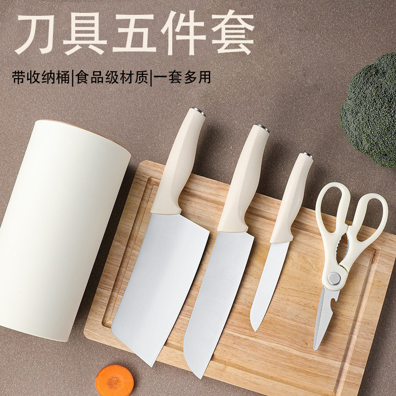 クロスボーダー厨房刃物セット収納桶付きステンレス包丁5点セット家庭用コックナイフ果物包丁セット