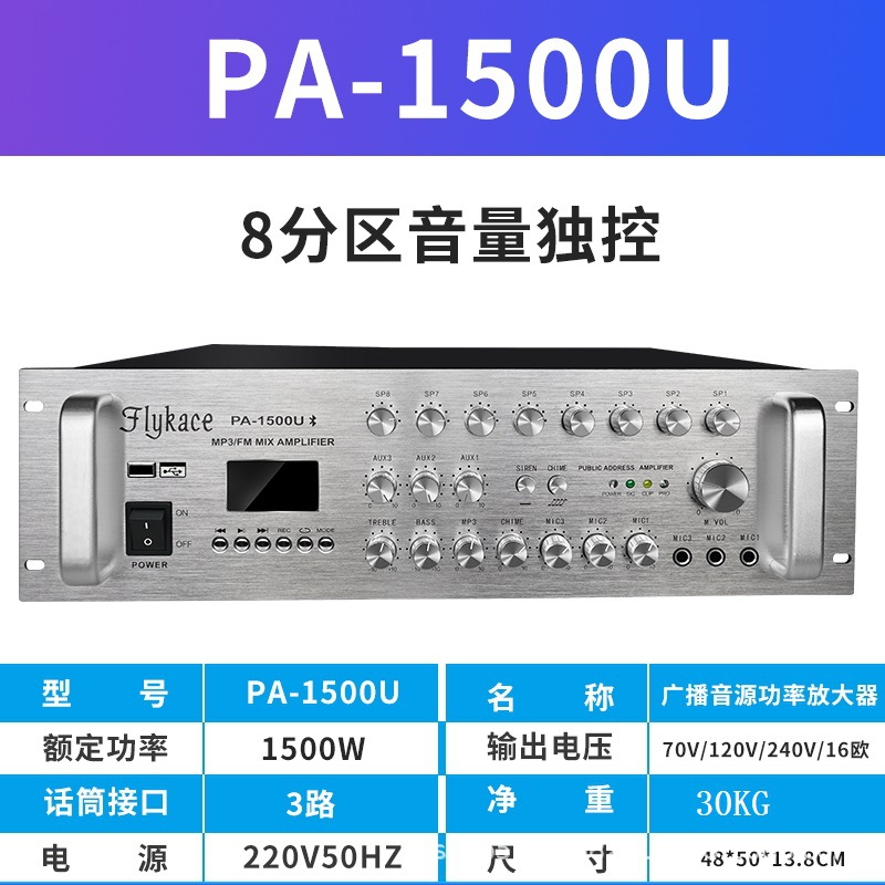Flykace PA-1500U定圧アンプ1500ワット放送功放機音柱用定圧アンプ