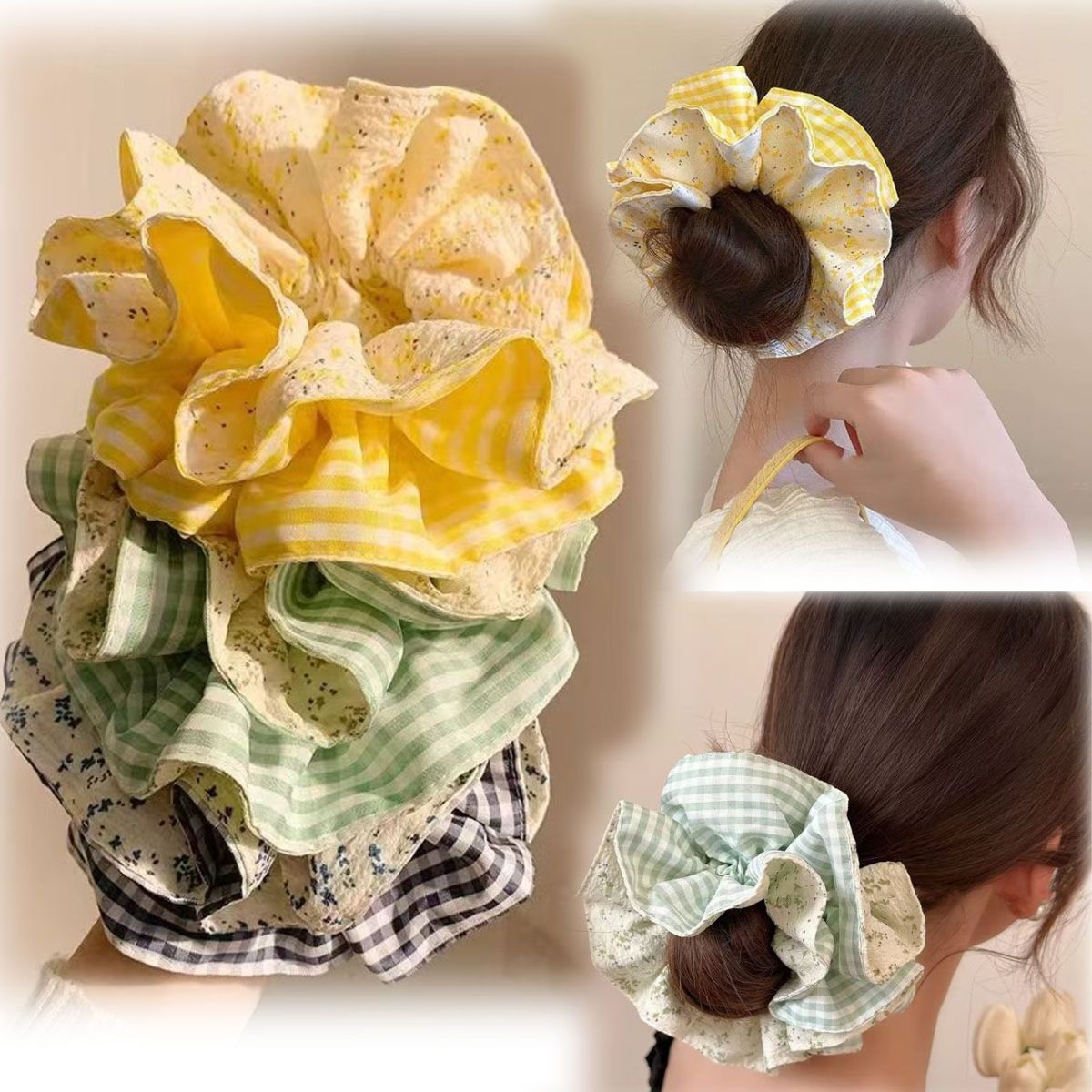 春夏の花柄ヘアゴム、女性用、大きいサイズ、サテン二層ウエストヘアゴム、ローポニーテール、万能ヘアロープヘアアクセサリー