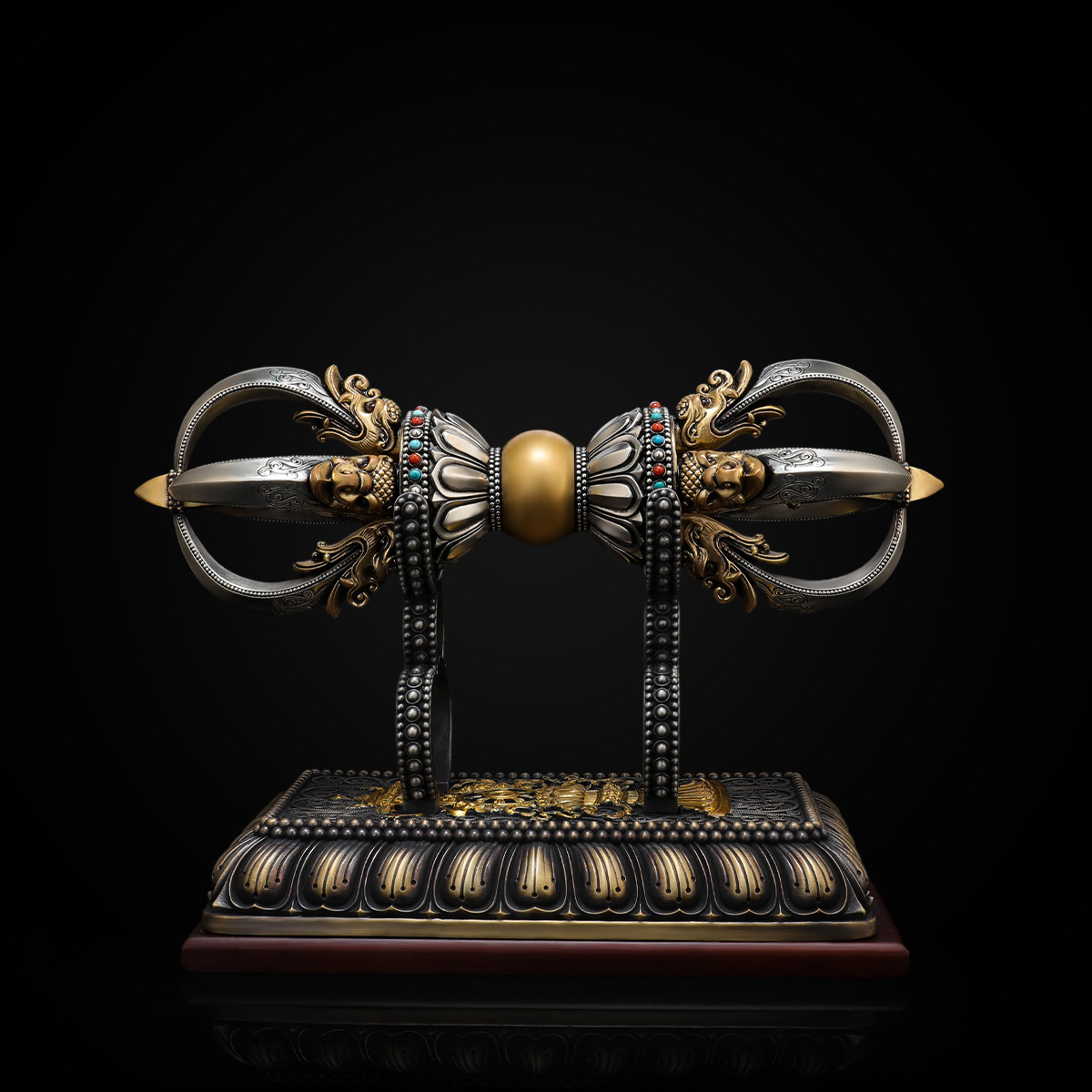 白銅の5株の金剛杵の置物は台座の2色の金銀を持って遊びます。