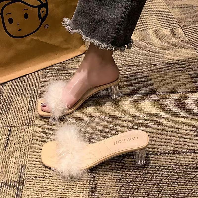 女性のための毛皮のようなスリッパ夏アウター 2025 新しいフェアリースタイルワンラインクリスタルスカートフレンチハイヒール透明サンダル女性のための