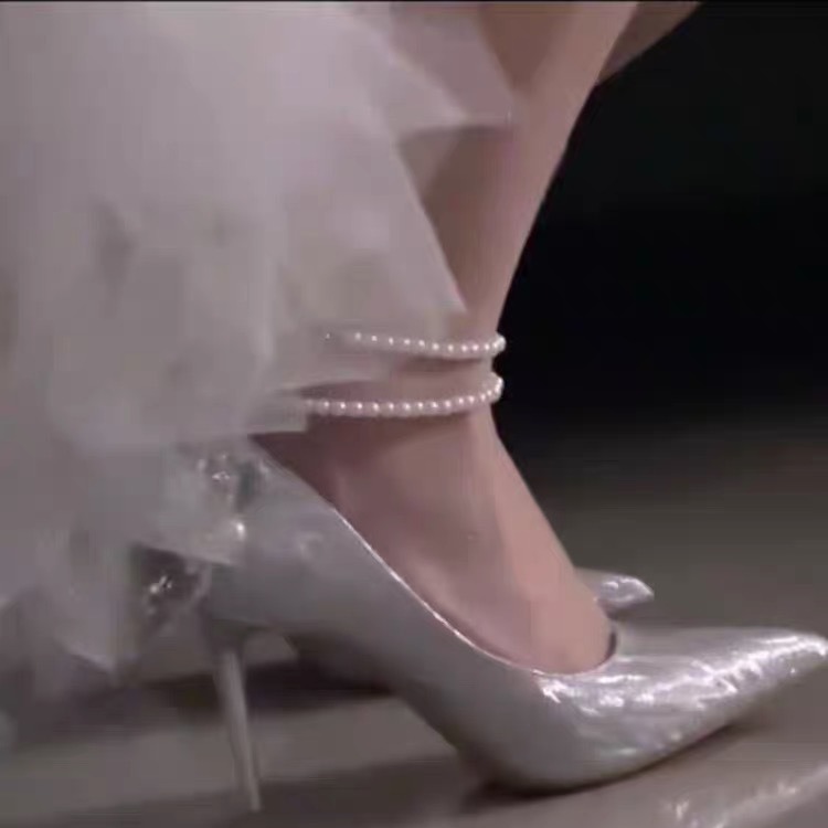 ハイヒールの女性の 2025 夏の新しいラインストーンリボンパールチェーンウェディングシューズポインテッドトゥスティレットシューズ