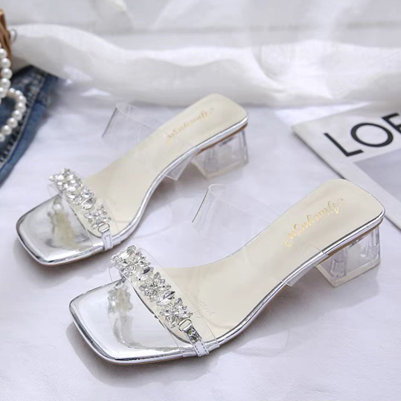 女性が外で履くサンダル 2025 夏の新しいスタイルの厚いヒールのラインストーンの妖精スタイルのスカート付きクリスタル透明なミッドヒールのスリッパ