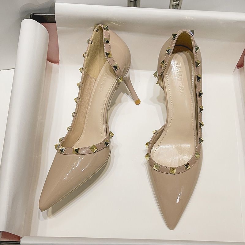 フェアリースタイルリベットハイヒール女性のための 2025 新しいスティレットヒールポインテッドトゥ浅い口セクシーなサイド中空パテントレザーフレンチシューズ