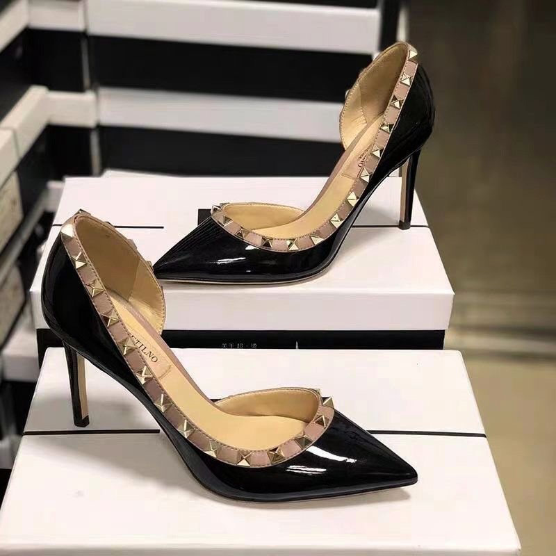 黒いリベットのハイヒールの女性2025年夏の新型の先の浅い口のセクシーな細いと気質の裸の色の側の空の靴