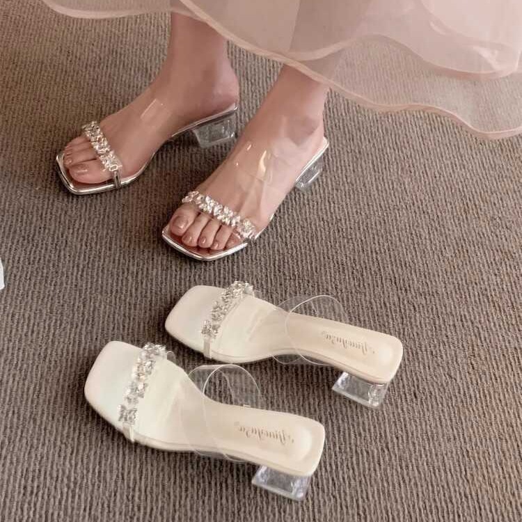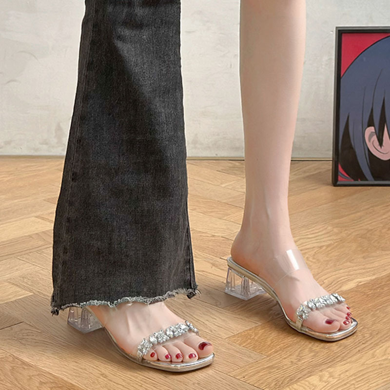 女性の夏のアウターウェア用サンダル 2025 新しいファッション透明なラインストーン気質厚いヒールクリスタルハイヒールスリッパ女性用