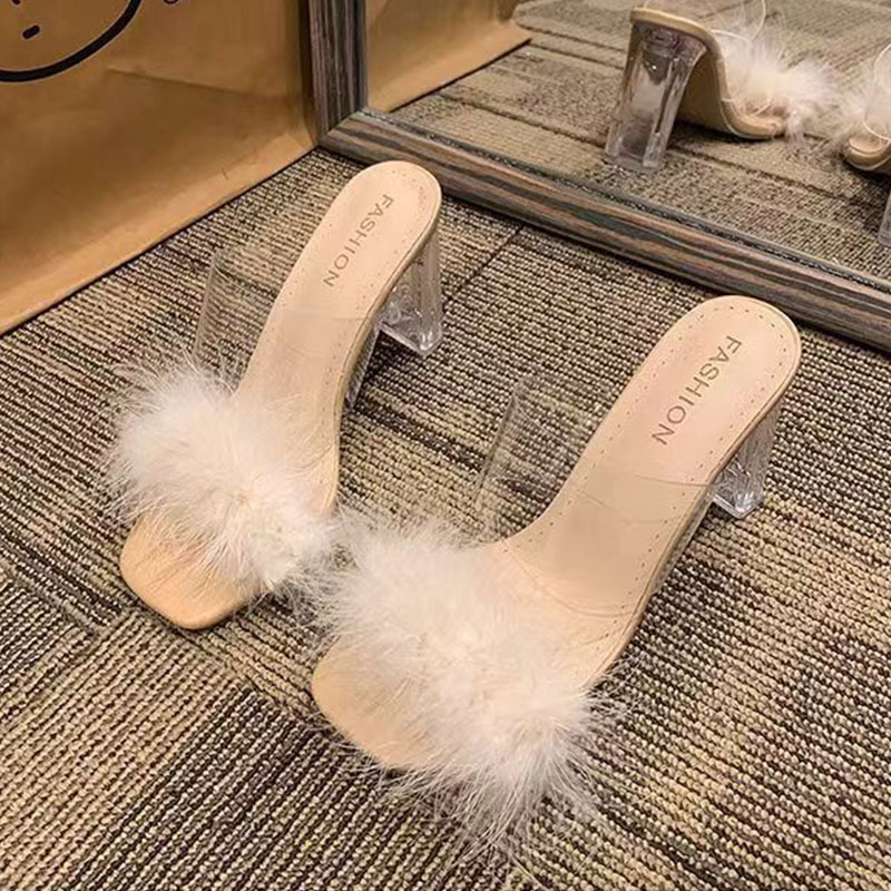 女性の夏のアウターウェア用の毛皮のようなサンダル 2025 新しいフェアリースタイルのワンラインクリスタル太いヒールとスカート付きフレンチハイヒール
