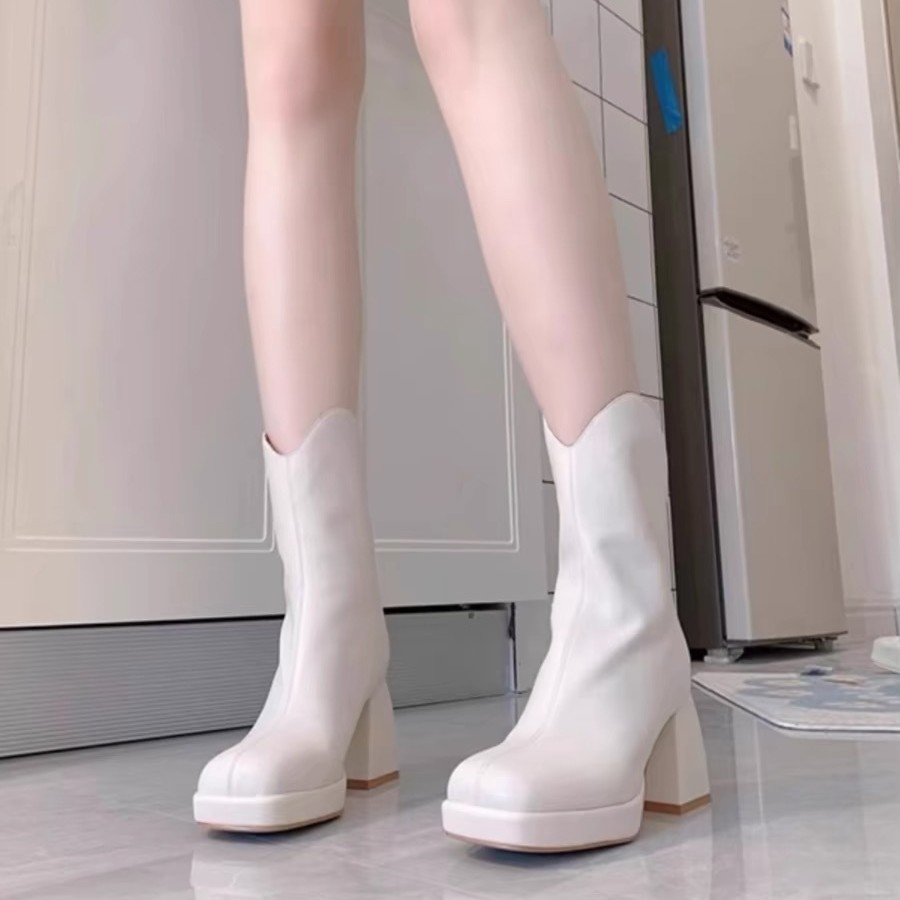 女性のための白い厚いヒールのショートブーツ 2025 新しい秋と冬のハイヒールの靴小柄な人向けの厚底マーティンブーツスリムシングルブーツ