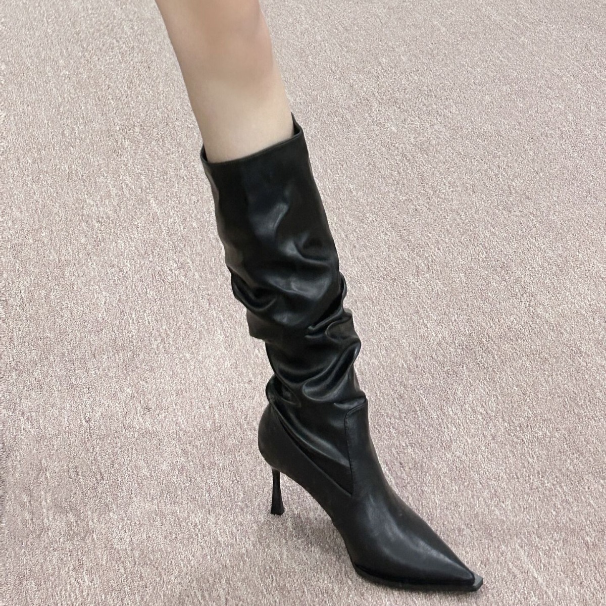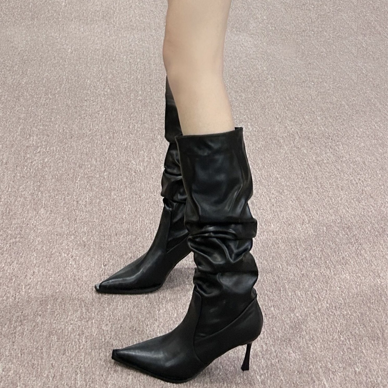ハイヒールブーツ女性の秋と冬の新しいスタイルのポインテッドトゥプリーツパイルブーツ黒のセクシーなホットガールオーバーニーブーツ